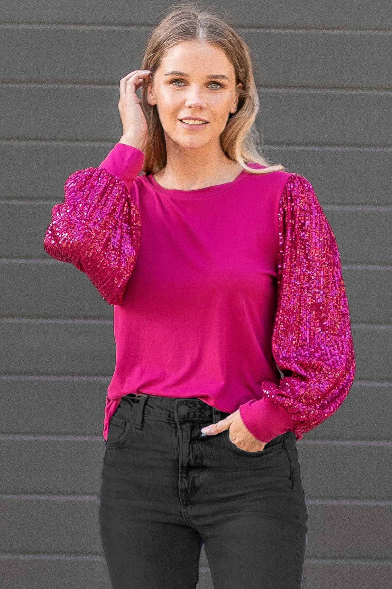 Solid Top with Sequins Detailed Sleeves. A sleek solid top with dazzling sequin detailed sleeves, adding a touch of glamour to any outfit, perfect for both casual and dressy occasions.