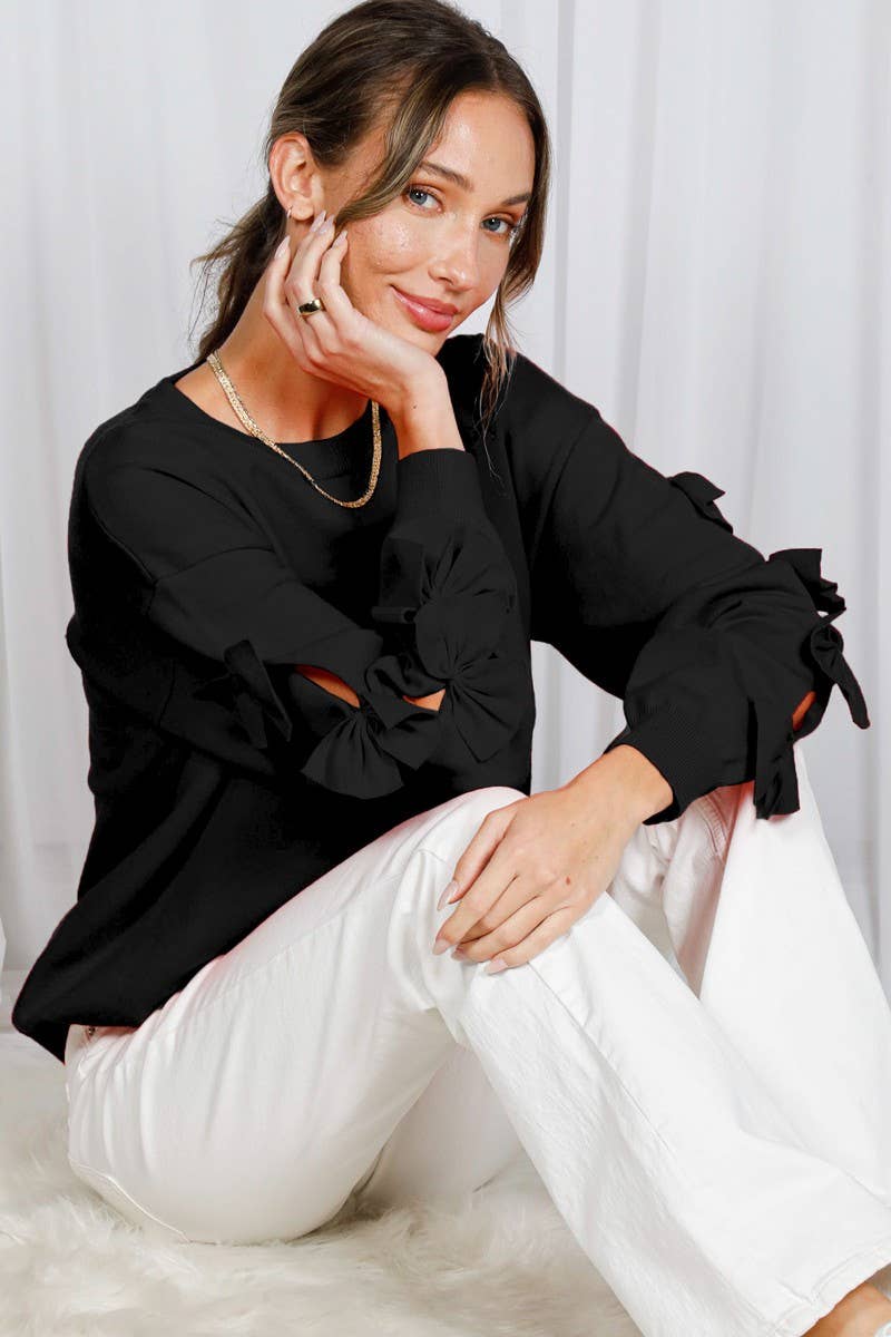 • Ribbed Crew neckline - Casual drop shoulder - Bow embellished open long-sleeve ribbed hem - The charming bow accent elevates this cozy piece, making it perfect for a touch of whimsy with your everyday look. - Pullover style - Soft touch and breathable for spring and fall casual wear. - Comfortable, relaxed fit Model is 5'8, 32-27-37, wearing SMALL